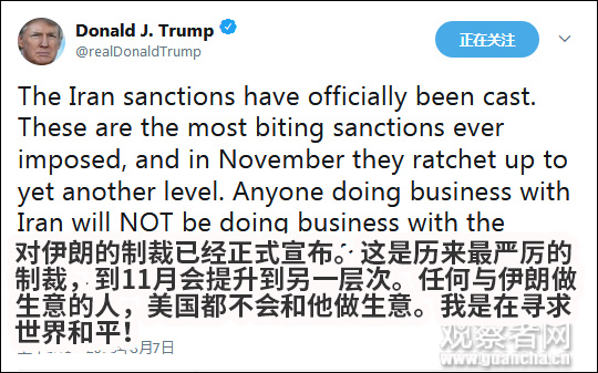 道達爾等與伊朗有業(yè)務往來的外國公司被告知,繼續(xù)在伊朗做生意,他們也會面臨二次制裁,“任何和伊朗做生意的人就別和美國做生意!碧乩势8月7日發(fā)推特稱。