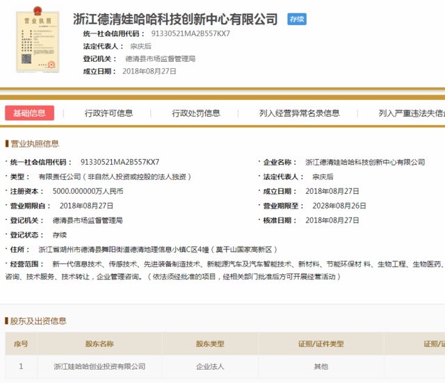 國(guó)家企業(yè)信用信息系統(tǒng)顯示,德清娃哈哈注冊(cè)資本為5000萬(wàn)元,娃哈哈集團(tuán)董事長(zhǎng)兼總經(jīng)理宗慶后擔(dān)任法人代表,企業(yè)惟一的股東就是娃哈哈創(chuàng)業(yè)投資有限公司。企業(yè)經(jīng)營(yíng)范圍涵蓋新一代信息技術(shù)、傳感技術(shù)、先進(jìn)裝備制造技術(shù)、新能源汽車及汽車智能技術(shù)、新材料、節(jié)能環(huán)保材料、生物工程、生物醫(yī)藥、醫(yī)療器械的技術(shù)開發(fā)、技術(shù)咨詢、技術(shù)服務(wù)、技術(shù)轉(zhuǎn)讓,企業(yè)管理咨詢。從經(jīng)營(yíng)范圍來(lái)看,該企業(yè)是一家名副其實(shí)的科技類企業(yè)。