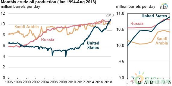 根據(jù)美國能源信息署提供的數(shù)據(jù),今年8月份美國石油產(chǎn)量高達(dá)每日1090萬桶,而俄羅斯是1080萬桶,沙特阿拉伯是1040萬桶。如果該數(shù)據(jù)被證實,將意味著美國自1973年失去石油產(chǎn)量“霸主”地位后,又重新回歸霸主地位。