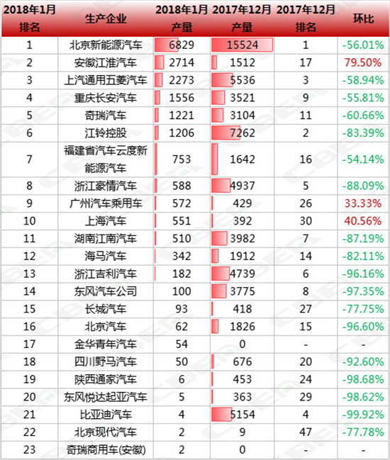 從車企來(lái)看,2018年1月生產(chǎn)純電動(dòng)乘用車的車企有23家,環(huán)比增長(zhǎng)的車企有3家,分別是安徽江淮汽車環(huán)比增長(zhǎng)79.5%,增長(zhǎng)幅度較大;廣州汽車環(huán)比增長(zhǎng)33.33%;上海汽車環(huán)比增長(zhǎng)40.56%。