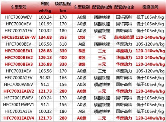 江淮汽車在2017年《新能源汽車推廣應(yīng)用推薦車型目錄》中共推出16款純電動(dòng)乘用車車型,其中,能量密度低于105wh/kg的車型有8款為A0級(jí)車,配套的動(dòng)力電池為國(guó)軒高科磷酸鐵鋰電池,續(xù)航里程在156-180km之間;能量密度在105-120wh/kg之間的車型有2款,一款為A級(jí)車,配套華霆?jiǎng)恿Φ牧姿徼F鋰電池,續(xù)航里程為310km;另一款為A0級(jí)車,配套華霆?jiǎng)恿Φ娜囯姵,續(xù)航里程為170km;能量密度在120-140wh/kg之間的車型有6款,其中有2款為A0級(jí)車,3款為B級(jí)車,1款為D級(jí)車,配套的動(dòng)力電池全部為華霆?jiǎng)恿θ囯姵兀m(xù)航里程在280-400km之間。