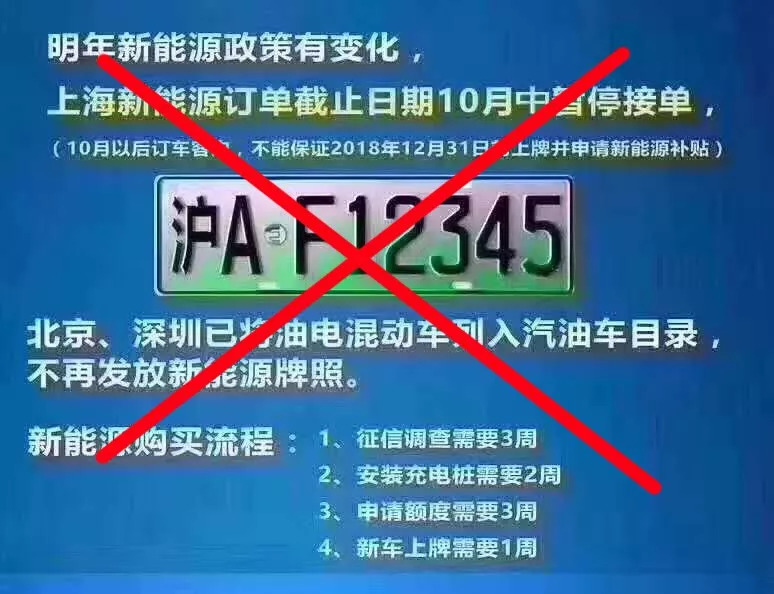 圖片上稱,“明年新能源政策有變化,上海新能源訂單截止10月暫!钡南⒃诰W(wǎng)絡(luò)上廣泛傳播。消息稱,不能保證10月以后在上海購買新能源汽車的用戶,在2018年12月31日前上牌、取得補(bǔ)貼。