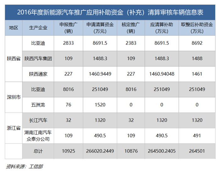 2016年度,三省市企業(yè)共申報新能源汽車推廣數(shù)量為10952輛,申請清算資金266020.2449萬元,最后核定推廣10876輛,應(yīng)補貼金額為264500.2405萬元。值得注意的是,當(dāng)年度只有深圳五洲龍汽車公司申請的76輛客車因未進入當(dāng)年推薦車型目錄,因此申請的1520萬元國補全部被取消。