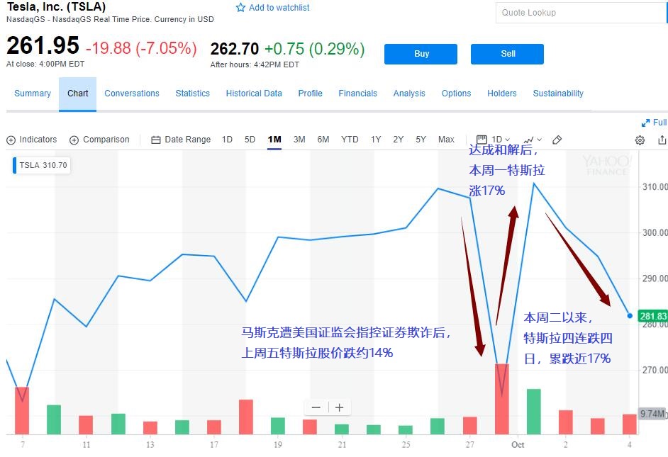 周末達(dá)成和解后,周一特斯拉當(dāng)天股價(jià)暴漲17%,創(chuàng)2013年5月以來最大單日漲幅,完全抹去了上周五的跌幅。周二特斯拉公布了創(chuàng)歷史新高的季度汽車產(chǎn)量,同時(shí)提到在中國市場面臨貿(mào)易相關(guān)挑戰(zhàn),當(dāng)天股價(jià)高開低走,收跌逾3%。