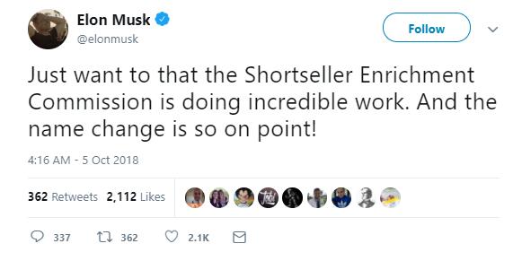 周四美股盤后,馬斯克發(fā)推文嘲諷SEC,說證監(jiān)會正在改名為簡稱同樣為SEC的“喂肥空頭的委員會”(Shortseller Enrichment Commission),然后又在另一條推文里說:人們有時(shí)忘了一家公司只是一群人為了生產(chǎn)產(chǎn)品集合在一起的,只要能生產(chǎn)偉大的產(chǎn)品,就有偉大的價(jià)值。