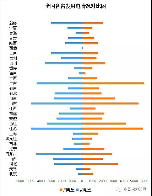 2017年,全國全口徑發(fā)電量64179億千瓦時,同比增長6.5%。2017年,全社會用電量63077億千瓦時,同比增長6.6%。全國分地區(qū)發(fā)用電情況對比如下圖所示: