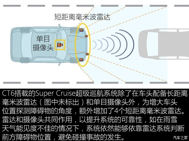 Super Cruise超級巡航系統(tǒng)用于監(jiān)控車輛所處環(huán)境的傳感器包括:1個(gè)長距離毫米波雷達(dá)、5個(gè)短距離毫米波雷達(dá),內(nèi)后視鏡位置的1個(gè)單目攝像頭,車輛四周的4個(gè)攝像頭,1個(gè)GPS定位系統(tǒng)、2個(gè)慣性導(dǎo)航傳感器以及存儲了高清地圖數(shù)據(jù)的控制單元。
