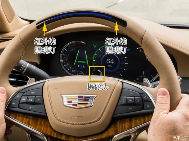 除了上述用于監(jiān)控環(huán)境的傳感器和進(jìn)行決策的控制單元外,Super Cruise超級巡航系統(tǒng)還在方向盤位置安裝了1個(gè)攝像頭,用于監(jiān)控駕駛員的注意力是否分散。為了在照明不足時(shí)照亮駕駛員面部,方向盤外環(huán)上還安裝了紅外線照明燈。而位于方向盤外環(huán)正中的是Super Cruise超級巡航系統(tǒng)的警示燈,在不同的情況下,該燈會亮起不同的顏色(紅色、藍(lán)色或綠色)來提示駕駛員。下文會有詳細(xì)介紹,請各位繼續(xù)往下看。