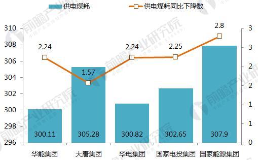 圖表7:2017年五大發(fā)電集團供電煤耗及下降數(shù)量對比(單位:克/千瓦時)