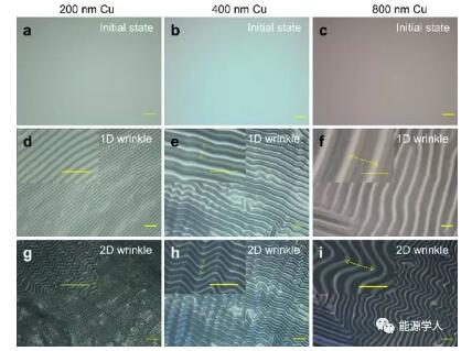 金屬電化學(xué)沉積產(chǎn)生壓應(yīng)力是一個被廣泛觀測到的事實(例如鋅,錫等),同時軟基材料上的金屬薄膜在壓應(yīng)力下會失穩(wěn)產(chǎn)生褶皺得以釋放應(yīng)力有著大量的研究(其中姜漢卿教授十幾年前曾利用這個機(jī)制研究了基于單晶硅的柔性可拉伸電子器件)?墒墙饘黉囋陔娀瘜W(xué)沉積中是否也產(chǎn)生壓應(yīng)力還是一個未被探索的問題。本文作者通過銅/PDMS軟基結(jié)構(gòu)發(fā)現(xiàn),金屬鋰在沉積過程中也會產(chǎn)生壓力,而失穩(wěn)釋放壓應(yīng)力可以有效控制枝晶產(chǎn)生。通過光學(xué)顯微鏡觀察,作者發(fā)現(xiàn)鋰沉積過程會使銅膜表面有規(guī)律的皺褶,皺褶由一維變?yōu)槎S,波長不變,振幅變大。這個皺褶行為可以用理論模型完美描述。這個實驗證明了鋰沉積過程中確實有壓應(yīng)力產(chǎn)生,而且這個壓應(yīng)力可以被釋放。