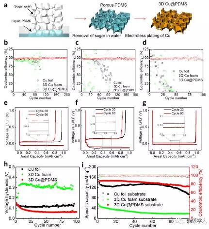 最后,通過該項研究還應(yīng)用方糖做為模板,制作了三維軟基電極,并且聯(lián)合優(yōu)化后的電解液對電池進(jìn)行了對比測試。在庫倫效率測試中,三維多孔軟基電極可以以1 mA/cm2的電流密度下循環(huán)超過200 次保持98% 以上的庫倫效率,而同樣條件下的,平面銅和三維銅泡沫在100個循環(huán)內(nèi)庫倫效率衰減到50% 以下。在3 mA/cm2高電流密度下,三維多孔軟基電極同樣能夠穩(wěn)定循環(huán)接近100次,而同等條件下的平面銅和三維銅泡沫在50個循環(huán)內(nèi)庫倫效率降到10% 以下。最后在全電池測試中,三維多孔軟基電極同樣優(yōu)于平面銅和三維泡沫銅的電化學(xué)性能。
