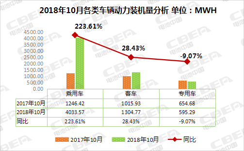 從車輛細(xì)分類別來(lái)看,2018年10月,我國(guó)新能源乘用車動(dòng)力電池裝機(jī)量約4.03Gwh,環(huán)比增長(zhǎng)22.29%,同比增長(zhǎng)223.61%,1-10月累計(jì)裝機(jī)量為21.6Gwh;新能源客車動(dòng)力電池裝機(jī)量約1.3Gwh,環(huán)比下降30.03%,同比增長(zhǎng)28.43%,1-10月累計(jì)裝機(jī)量為10.2Gwh;新能源專用車動(dòng)力電池裝機(jī)量約0.55Gwh,環(huán)比增長(zhǎng)7.57%,同比下降9.07%,1-10月累計(jì)裝機(jī)量為2.8Gwh。