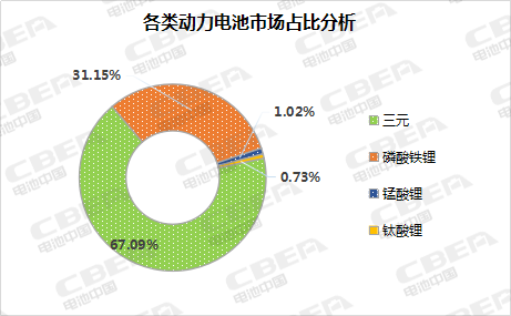 從不同動(dòng)力電池類型來(lái)看,5.93Gwh裝機(jī)總量中,三元?jiǎng)恿﹄姵匮b機(jī)量為3.98Gwh,占比67.09%;磷酸鐵鋰動(dòng)力電池裝機(jī)量為1.85Gwh,占比31.15%;錳酸鋰動(dòng)力電池裝機(jī)量為0.06Gwh,占比1.02%;鈦酸鋰動(dòng)力電池裝機(jī)量為0.04Gwh,占比0.73%。
