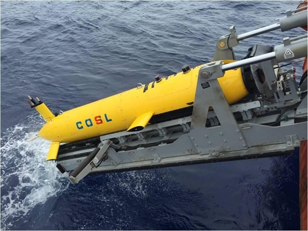 此臺(tái)AUV(AutonomousUnderwaterVehicle)采用模塊化設(shè)計(jì)、流線型魚(yú)雷結(jié)構(gòu),可在水下連續(xù)作業(yè)24小時(shí),作業(yè)最大水深達(dá)3000米,可隨時(shí)獲取所處深度和海底高度數(shù)據(jù)。今年9月,在南海東部海域,此臺(tái)AUV完成一項(xiàng)水深2700米超深水井場(chǎng)調(diào)查,刷新國(guó)內(nèi)AUV調(diào)查和JPC大型活塞重力取樣工程勘察作業(yè)水深紀(jì)錄。