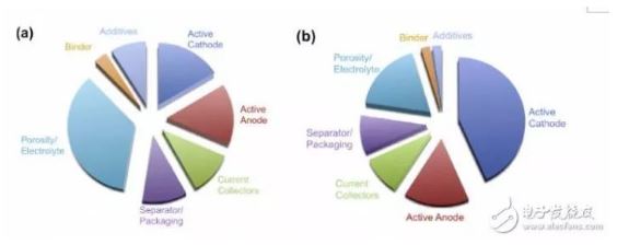 (現(xiàn)在鋰離子電池各組分的(a)體積占比和(b)質(zhì)量占比)