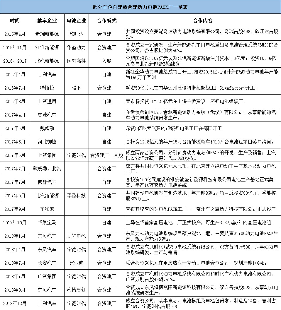 今年以來,整車企業(yè)儲(chǔ)備動(dòng)力電池、與動(dòng)力電池企業(yè)合資、自建Pack廠、自建電池研發(fā)中心等事例越來越多。在動(dòng)力電池降成本、競(jìng)爭(zhēng)激烈、標(biāo)準(zhǔn)化制造以及補(bǔ)貼退坡等的大環(huán)境下,無論從產(chǎn)業(yè)發(fā)展的角度,還是從技術(shù)發(fā)展的角度來看,主機(jī)廠自建/與電池廠戰(zhàn)略合作將成必然發(fā)展趨勢(shì)。