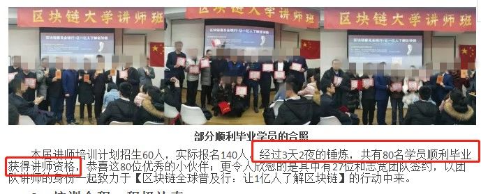 另外,據(jù)媒體調查發(fā)現(xiàn),某些所謂的區(qū)塊鏈講師,是通過3天2夜的培訓出來的,很難想象三天時間能夠學到點什么,但不妨礙該培訓學校發(fā)講師資格證書并拍照留念。