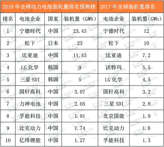 那么,我們可以預(yù)測(cè)2018年全球動(dòng)力電池裝機(jī)量前10排名為:寧德時(shí)代、松下、比亞迪名列前三,LG化學(xué)、三星SDI、國(guó)軒高科、孚能科技、天津力神、比克電池和億緯鋰能分別名列第四至第十。對(duì)比2017年排名可以看出,寧德時(shí)代、松下、比亞迪前三甲地位無可撼動(dòng),且領(lǐng)先優(yōu)勢(shì)進(jìn)一步鞏固;力神電池、億緯鋰能將是新面孔,而沃特瑪、北京國(guó)能則跌落榜單。