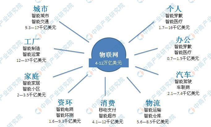 目前,物聯(lián)網(wǎng)主要應(yīng)用于個(gè)人、辦公、汽車、物流、消費(fèi)、資環(huán)、家庭、工廠和城市九大方面,全球物聯(lián)網(wǎng)產(chǎn)值4—12萬(wàn)億美元,涉及生活與工作方方面面。其中,智能城市、智能交通、智能穿戴、智能醫(yī)療市場(chǎng)最為可期。