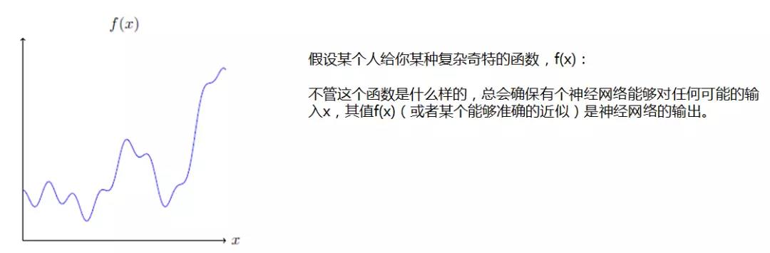 不管這個函數(shù)是什么樣的,總會確保有個神經(jīng)網(wǎng)絡(luò)能夠?qū)θ魏慰赡艿妮斎離,其值f(x)(或者某個能夠準(zhǔn)確的近似)是神經(jīng)網(wǎng)絡(luò)的輸出。