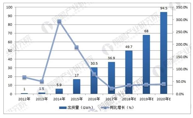 據(jù)研究顯示,動(dòng)力電池出貨量從2014年的5.9GWh攀升至2015年的17.0Gwh,同比增長(zhǎng)接近2倍。2016年中國(guó)動(dòng)力電池出貨量達(dá)30.5GWh,同比上年增80%。