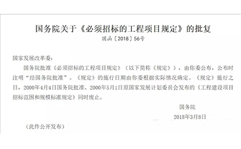 國務(wù)院批準《必須招標的工程項目規(guī)定》(以下簡稱《規(guī)定》),由你委公布,公布時注明“經(jīng)國務(wù)院批準”。《規(guī)定》的施行日期由你委根據(jù)實際情況確定!兑(guī)定》施行之日,2000年4月4日國務(wù)院批準、2000年5月1日原國家發(fā)展計劃委員會發(fā)布的《工程建設(shè)項目招標范圍和規(guī)模標準規(guī)定》同時廢止。