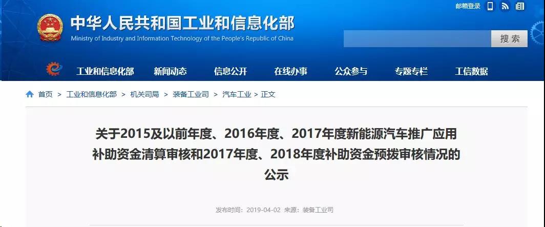 4月2日,工信部發(fā)布了“2015及以前年度、2016年度、2017年度新能源汽車推廣應(yīng)用補(bǔ)助資金清算審核”和“2017年度、2018年度補(bǔ)助資金預(yù)撥審核”結(jié)果予以公示。
