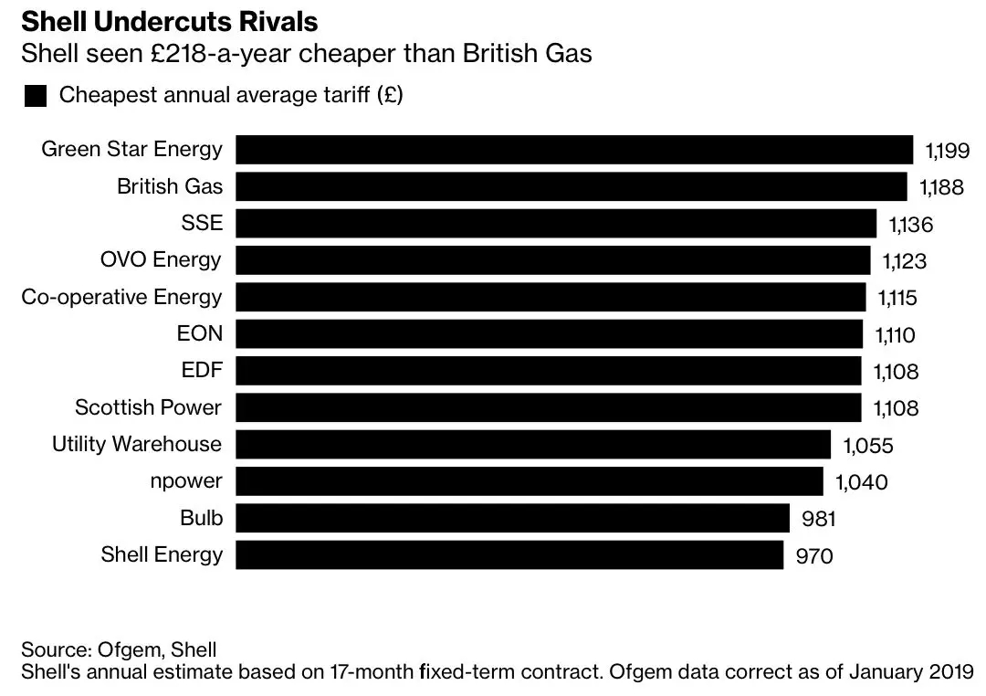 蘭皇家殼牌有限公司在英國(guó)的供電公司——?dú)づ颇茉垂荆ㄇ吧頌镕irstUtilityLtd.)推出每年970英鎊(1278美元)的固定電費(fèi),也就是說(shuō)每月8英鎊的固定電費(fèi),有效期到2020年7月。殼牌能源的新電價(jià)創(chuàng)造英國(guó)供電價(jià)格的最低水平,低于此前英國(guó)最便宜的電力供應(yīng)商BulbEnergyLtd.(該公司的年固定電費(fèi)為981英鎊/年)。此舉將給英國(guó)電力市場(chǎng)帶來(lái)更多壓力,大量客戶正在放棄了傳統(tǒng)的六大電力公司。殼牌的電價(jià)比英國(guó)天然氣公司的電價(jià)便宜了218英鎊,而英國(guó)天然氣去年已經(jīng)失去了742,000名客戶(2018年第三季度仍占了英國(guó)電力市場(chǎng)19%的份額)。