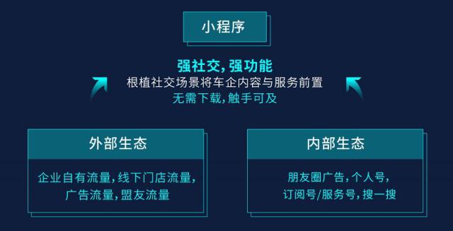 以小程序構(gòu)建社群——新能源車企以強社交、強功能的小程序為核心構(gòu)建社群,全面整合企業(yè)自有流量,線下門店流量,廣告流量,盟友流量等外部流量資源和微信公眾號廣告,朋友圈廣告,搜一搜等內(nèi)部生態(tài)資源,獲取首批車主、企業(yè)高管以及KOL等種子用戶。
