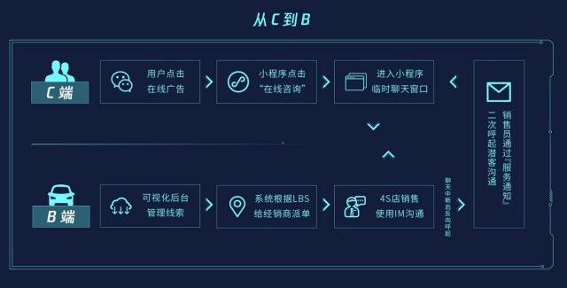 從C到B潛客直連——后續(xù),通過新能源高效潛客直連系統(tǒng),喚起C端用戶與B端(經(jīng)銷商、4S店)之間的雙向?qū)。即當C端用戶點擊廣告,進入小程序咨詢時,基于LBS技術(shù),相應(yīng)的B端客服人員同時被喚起,在后臺響應(yīng),實現(xiàn)快速溝通。即使出現(xiàn)信號不穩(wěn)定的情況,客服人員還可進行反向呼叫,帶來真正的高效潛客轉(zhuǎn)化效果。