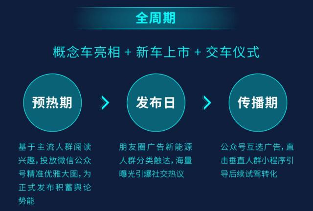 全周期——概念車亮相、新車上市、交車儀式可謂是新能源車企發(fā)聲造勢最為重要的節(jié)點。騰訊從預(yù)熱期到傳播期基于閱讀興趣、位置等場景進行全景投放,為新能源車企重要事件提升輿論勢能。