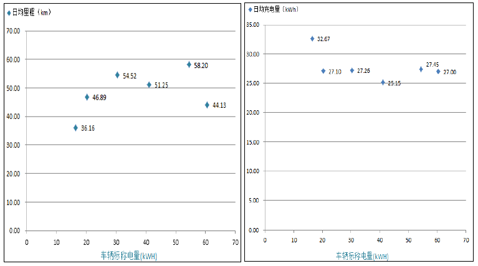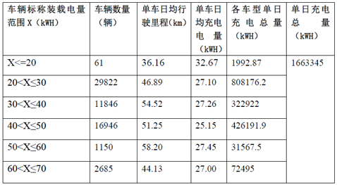 以2018年6月新能源汽車北京市級監(jiān)控平臺獲取的部分車輛數(shù)據(jù)為基礎,按照車輛裝載電池的電量進行劃分,計算各品牌、型號車輛的日均充電量。其中剔除掉日均充電量和日均耗電量差異值達到25%以上的異常數(shù)據(jù)后,總計6.251萬輛純電動汽車的日均行駛和充電數(shù)據(jù)如下表所示: