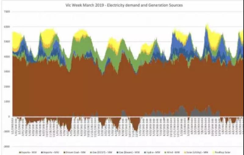 以下截圖來(lái)自opennem.org.au,內(nèi)容是維多利亞3月份發(fā)布的一周的“各類電源發(fā)電和用電需求圖”。在圖中可以看出,大部分電力來(lái)源于褐煤發(fā)電;還有部分來(lái)源于風(fēng)力發(fā)電(綠色區(qū)域),屋頂光伏發(fā)電(黃色區(qū)域)和光伏發(fā)電(橙色區(qū)域);另外, 在風(fēng)力比較弱時(shí),對(duì)于水力發(fā)電(藍(lán)色區(qū)域)的需求較高。