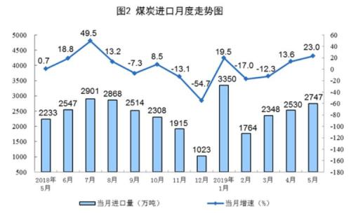 5月份進(jìn)口煤炭2747萬(wàn)噸,同比增長(zhǎng)23.0%,比上月增加217萬(wàn)噸;1—5月份進(jìn)口煤炭12739萬(wàn)噸,同比增長(zhǎng)5.6%。