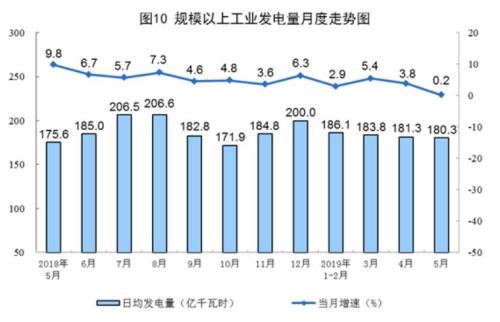 5月份,發(fā)電5589億千瓦時(shí),同比增長(zhǎng)0.2%。受5月工作日減少一天、去年同期高溫天氣基數(shù)較高等因素影響,電力生產(chǎn)增速有所放緩,增速較上月回落3.6個(gè)百分點(diǎn),較去年同期回落9.6個(gè)百分點(diǎn)。日均發(fā)電180.3億千瓦時(shí),環(huán)比減少1.0億千瓦時(shí)。1—5月份,發(fā)電2.8萬(wàn)億千瓦時(shí),增長(zhǎng)3.3%,增速較去年同期回落5.2個(gè)百分點(diǎn)。