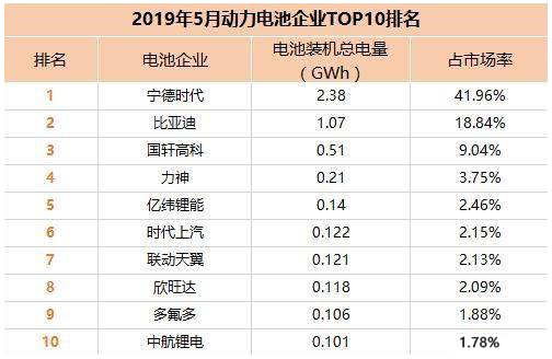 2019年5月國內(nèi)動力電池裝機總電量約5.68GWh,同比增長26%,環(huán)比增長5%。排名前十的動力電池企業(yè)裝機電量合計4.89GWh,約占整體的86%,動力電池行業(yè)集中度上升。