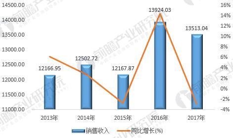 圖表3:2013-2017年電線電纜行業(yè)銷售收入及增長率變化趨勢圖(單位:億元,%)
