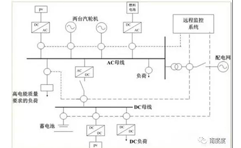 日本是亞洲研究和建設(shè)微電網(wǎng)較早的國家,自2003年開始,日本新能源與工業(yè)技術(shù)發(fā)展組織(NewEnergyandIndustrialTechnologyDevelopmentOrganization,NEDO)就協(xié)調(diào)高校、科研機(jī)構(gòu)和企業(yè)先后在八戶市、愛知縣、京都市和仙臺市等多地區(qū)建設(shè)了微電網(wǎng)示范工程,研究、驗(yàn)證了一批微電網(wǎng)關(guān)鍵技術(shù),其發(fā)展目標(biāo)主要定位于能源供給多樣化、減少污染、滿足用戶的個(gè)性化電力需求。日本采用的微電網(wǎng)結(jié)構(gòu)如圖所示