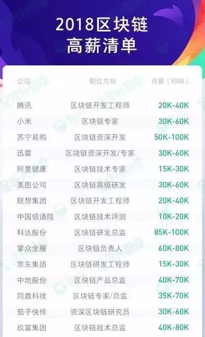 同樣,拉勾網(wǎng)近日則發(fā)布了“2018年區(qū)塊鏈高薪清單”,其中騰訊、阿里、京東、小米等大型互聯(lián)網(wǎng)公司發(fā)布了眾多高薪區(qū)塊鏈崗需求,近兩個(gè)月薪資最高開到了100k,區(qū)塊鏈人才受到熱捧。