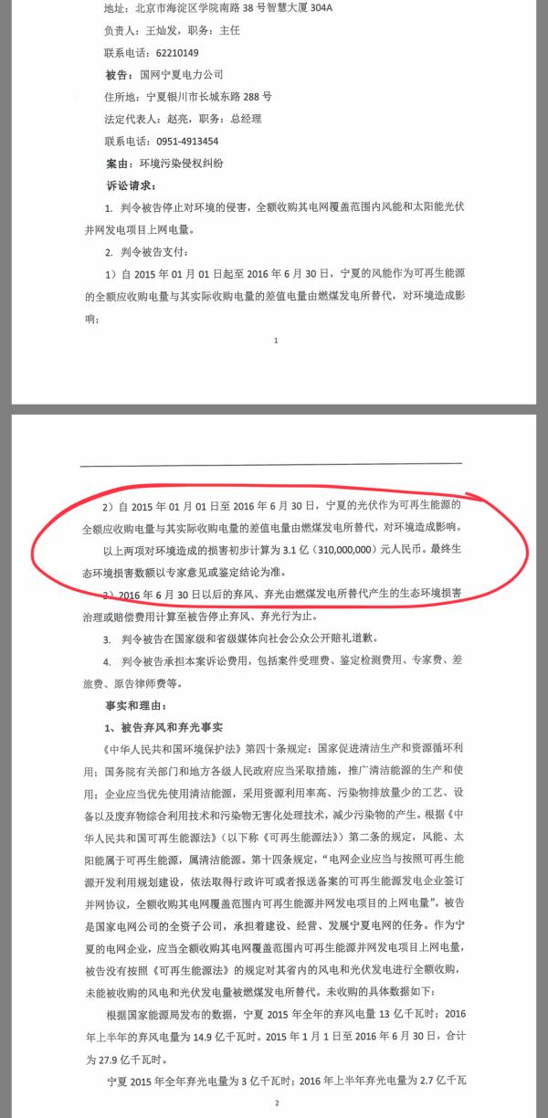 訴狀中寫道,2015年~2016年6月底期間,寧夏燃煤發(fā)電替代的風(fēng)電和光電,對環(huán)境造成的損害初步計算為3.1億元(最終數(shù)額以專家意見或鑒定結(jié)論為準(zhǔn)),法院應(yīng)判令被告支付這一數(shù)額。